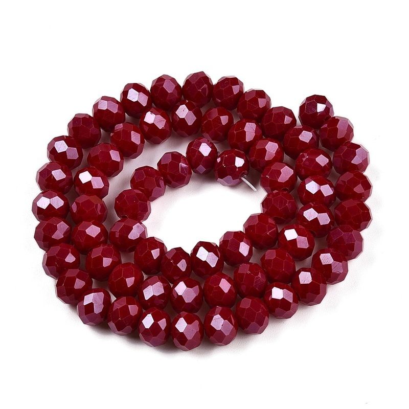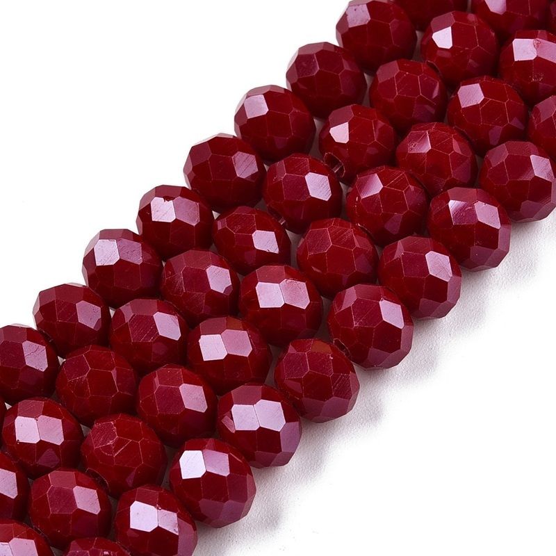 Добавете елегантност към вашите бижута с тези стъклени фасетирани мъниста с перлено червен блясък! Идеални за създаване на колиета, гривни и обеци.
