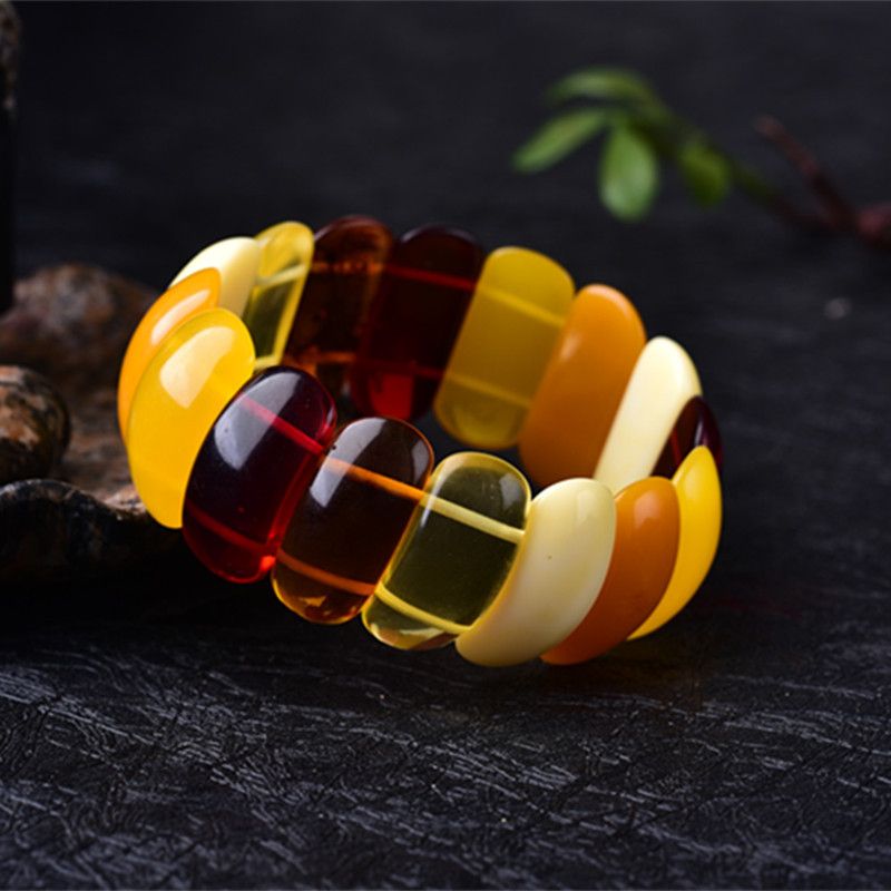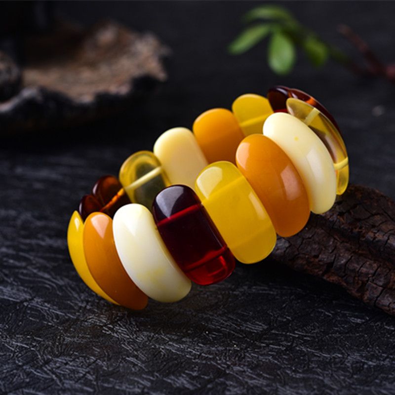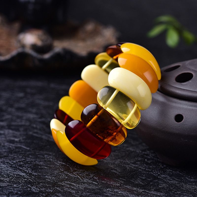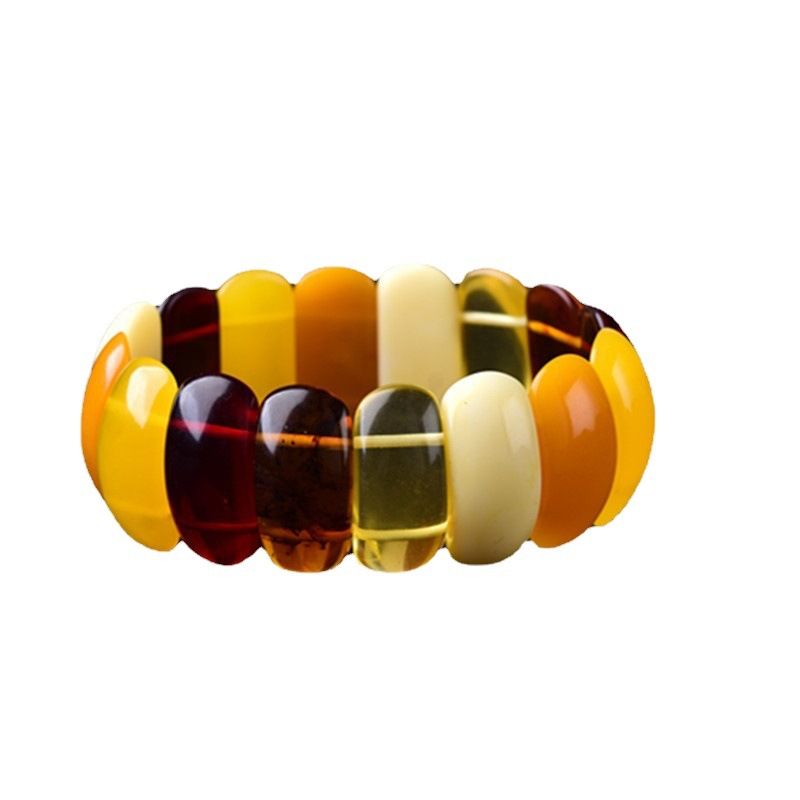 Елегантна разтегателна гривна, изработена от 5 вида естествен кехлибар, полирани мъниста. Вътрешен диаметър около 70 мм. Подходяща за всеки стил и повод.