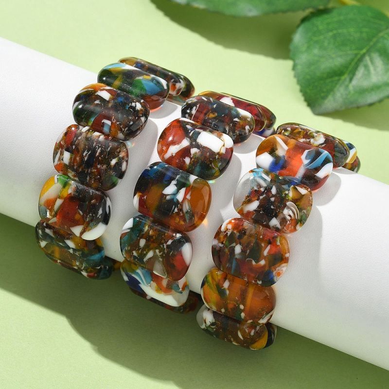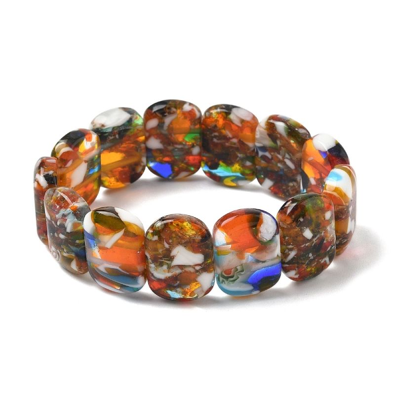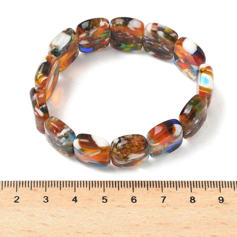 Гривни с мъниста Lampwork (лампуърк) са истинско произведение на изкуството. Всяко мънисто е уникално, благодарение на техниката Lampwork, която придава неповторими цветове и шарки. Правоъгълната форма на мънистата добавя модерен акцент към класическия дизайн на гривна. Смесените цветове я правят лесна за комбиниране с различни дрехи и аксесоари.