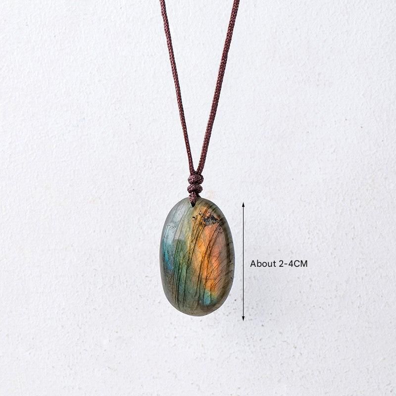 Колие с висулка от естествен лабрадорит, известен със своите преливащи се цветове и блясък. Формата на камъка е овална или кръгла, което придава елегантност и изтънченост на бижуто. Всяко колие е уникално, тъй като естествените характеристики на лабрадорита варират.