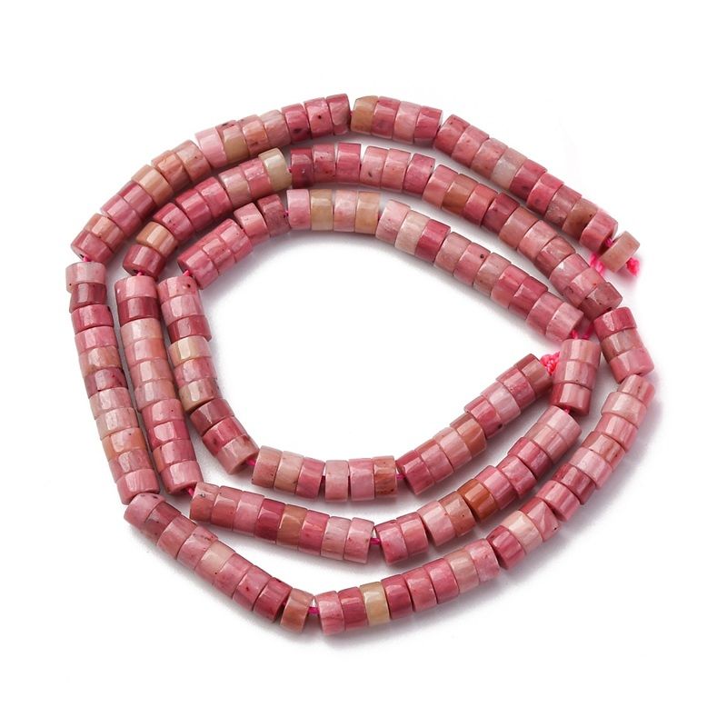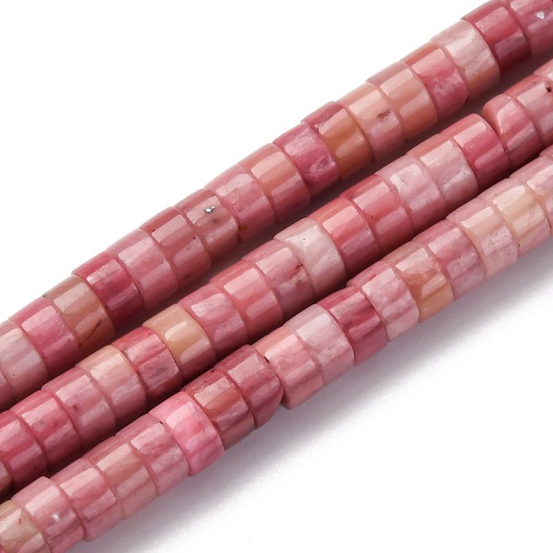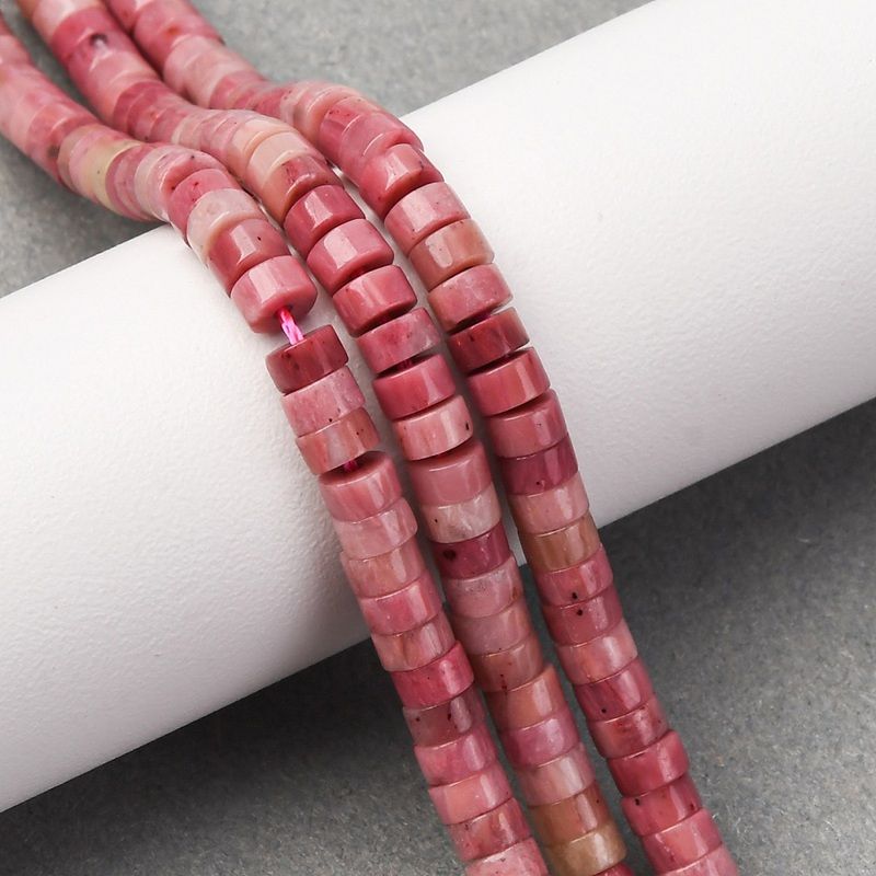 Добавете нежен акцент към вашите бижута с тези естествени мъниста от родонит! Всеки наниз съдържа около 149-153 Heishi мъниста с размери 4.5x2.5 мм и отвор 0.9 мм, нанизани с дължина 37.7-38 см.