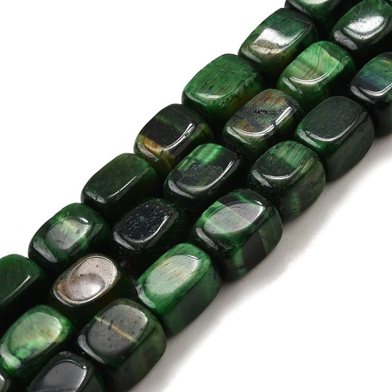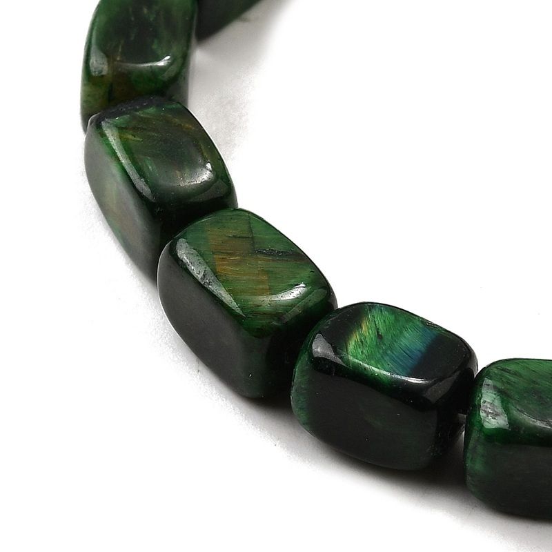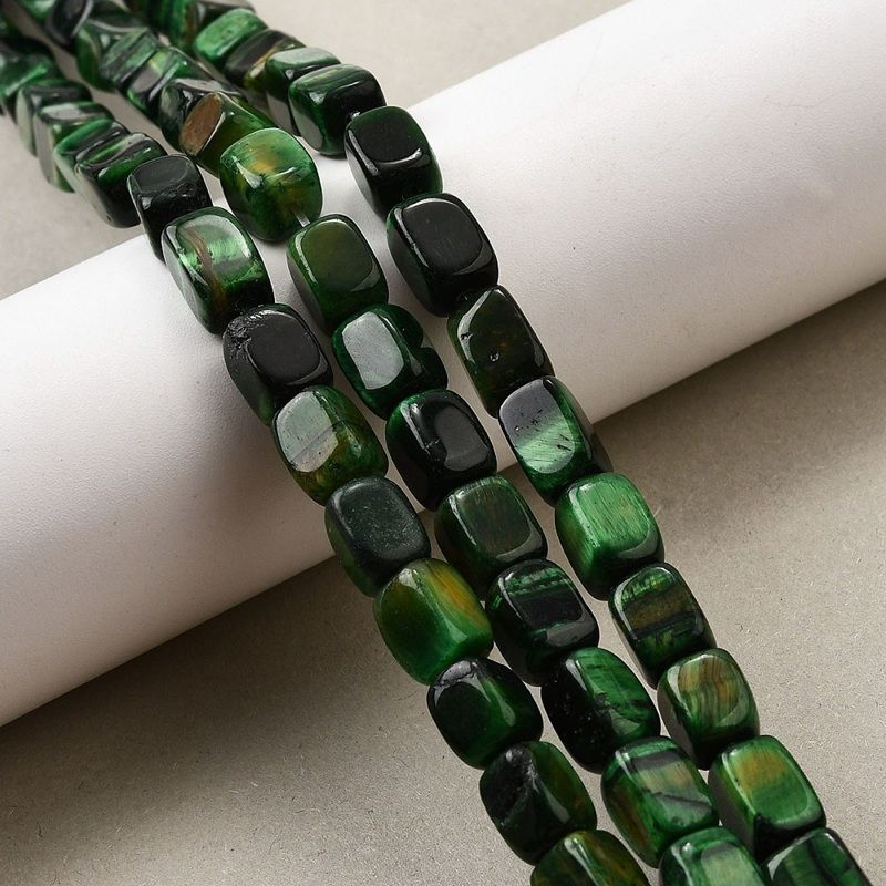 Мъниста от Тигрово Око с наситено зелен цвят, който е добавен допълнително с цел, създаване на модерна цветова гама. Кубоидната форма с леко заоблени ръбове придава модерен и изчистен вид.