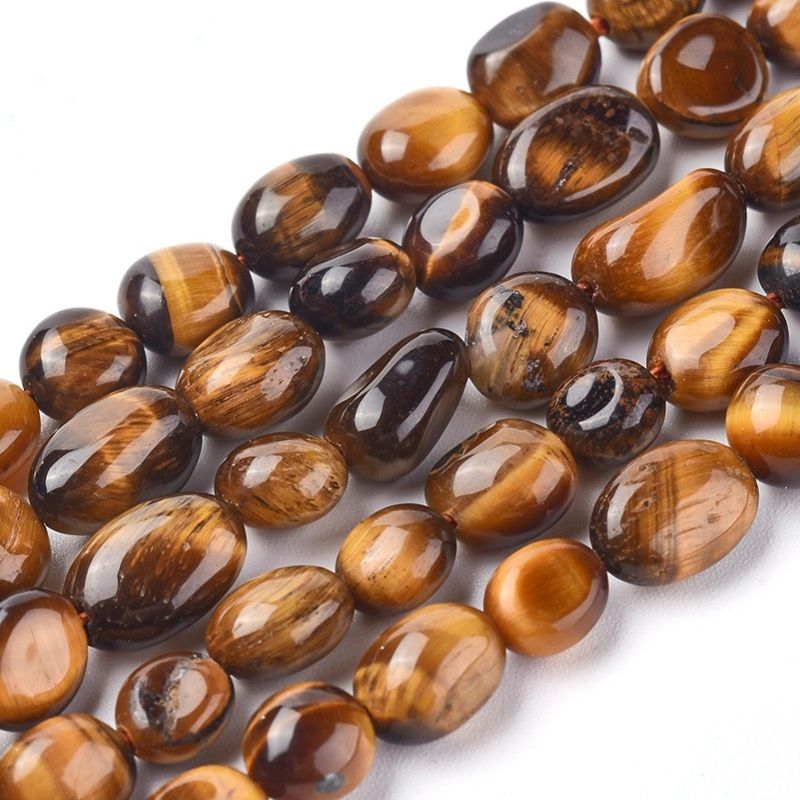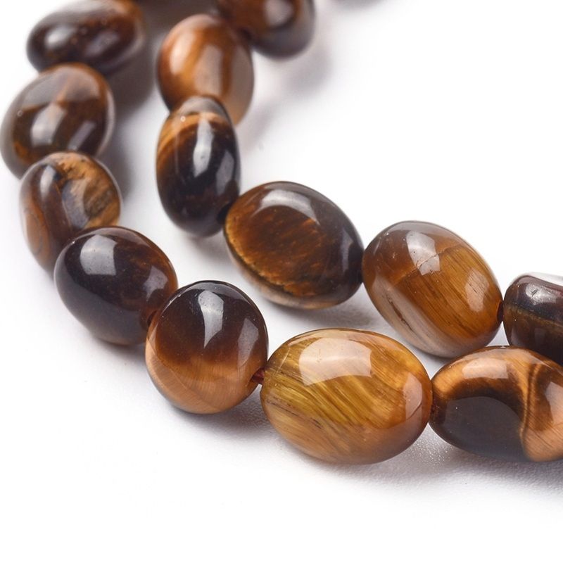 Мъниста от Тигрово око преливат в топли, землисти цветове. Свободната им форма придава елегантност и уникалност на всеки проект.