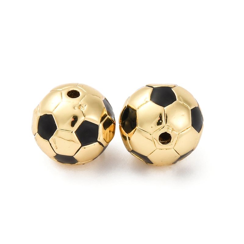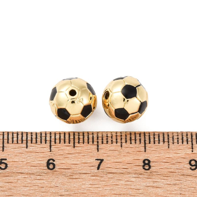 Добавете спортен акцент към бижутата си с мънисто футболна топка, изработено от месинг с реално 18К златно покритие и черен емайл, идеално за персонализирани проекти.
