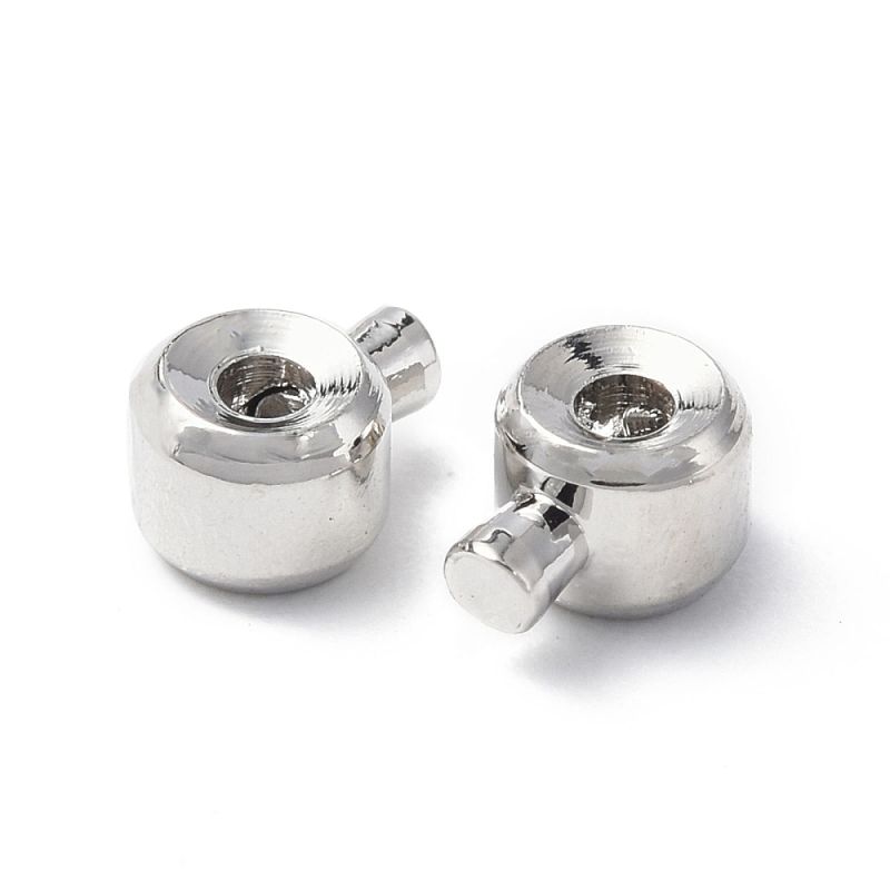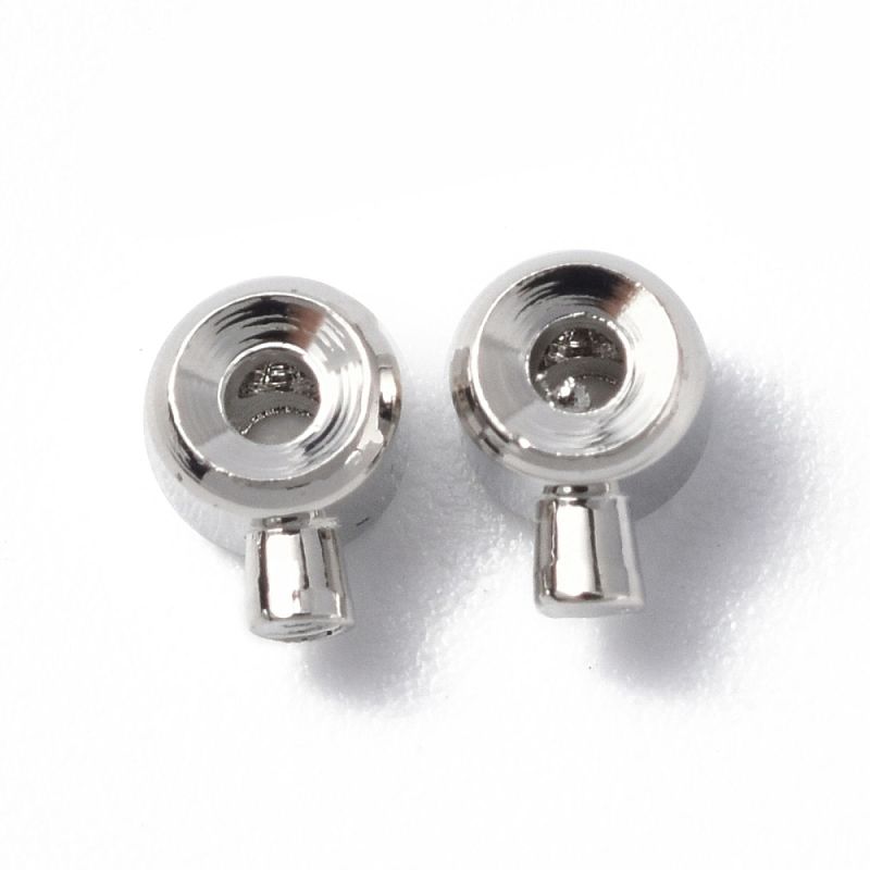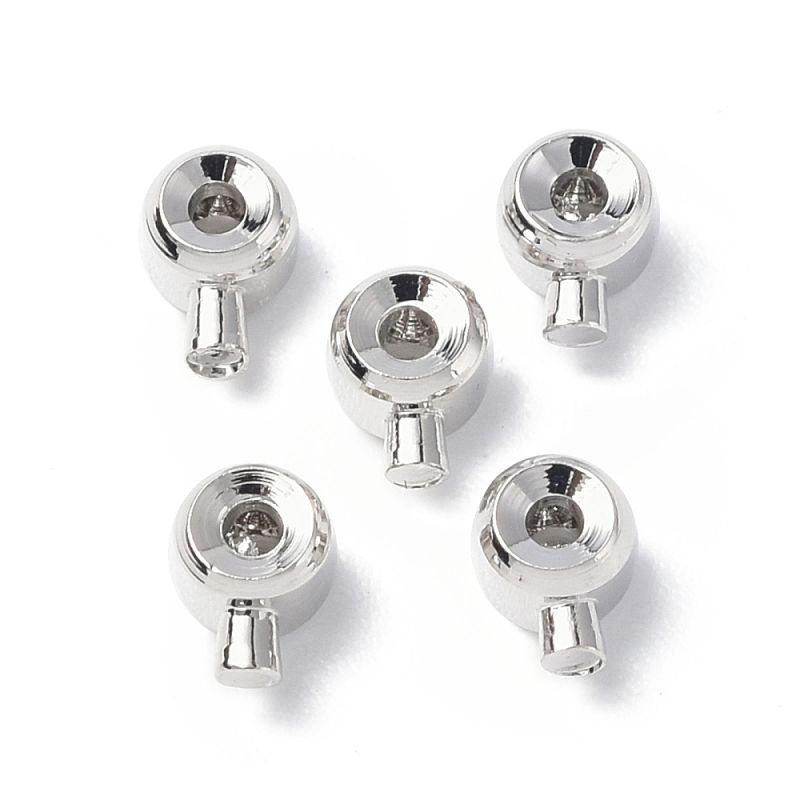 Сребристи цилиндрични стопери с щифт изработени от месинг, перфектни за завършване на вашите бижутерски проекти. Идеални за фиксиране на мъниста по протежение на основата ( тел, корда ) за създаване на сигурно фиксиране или декорация.