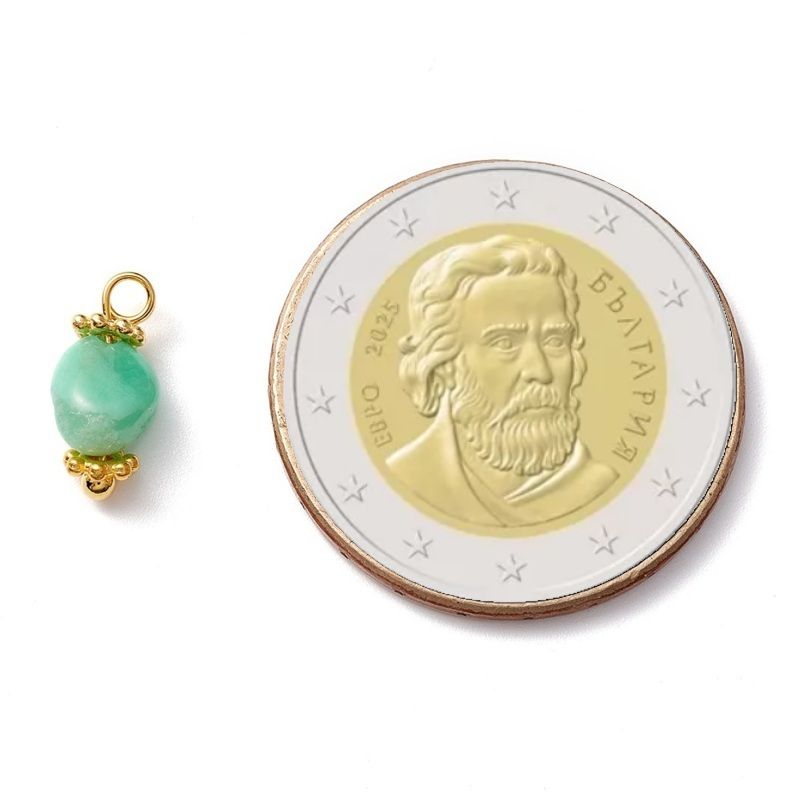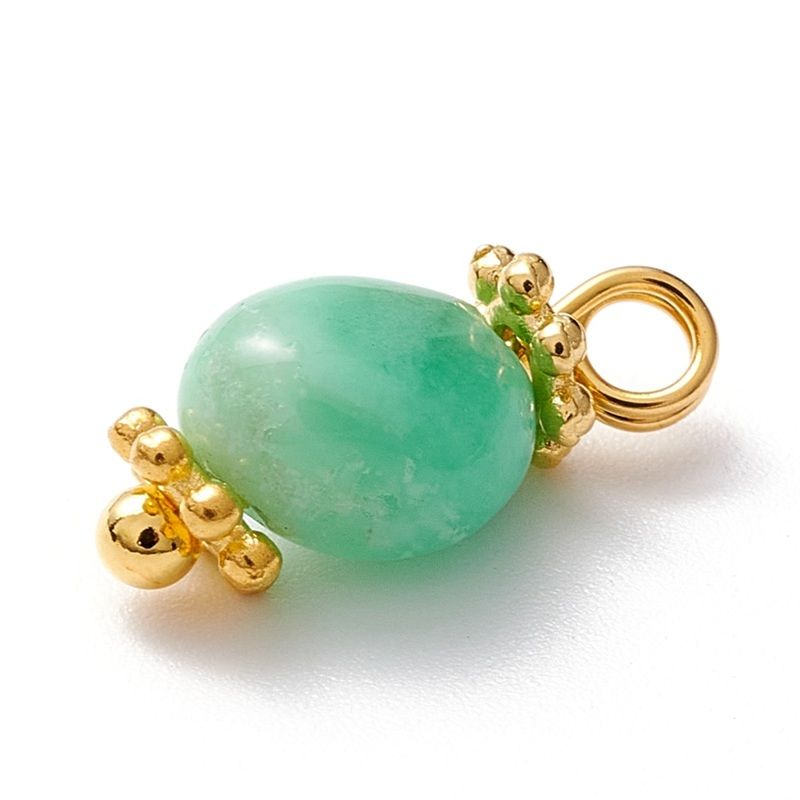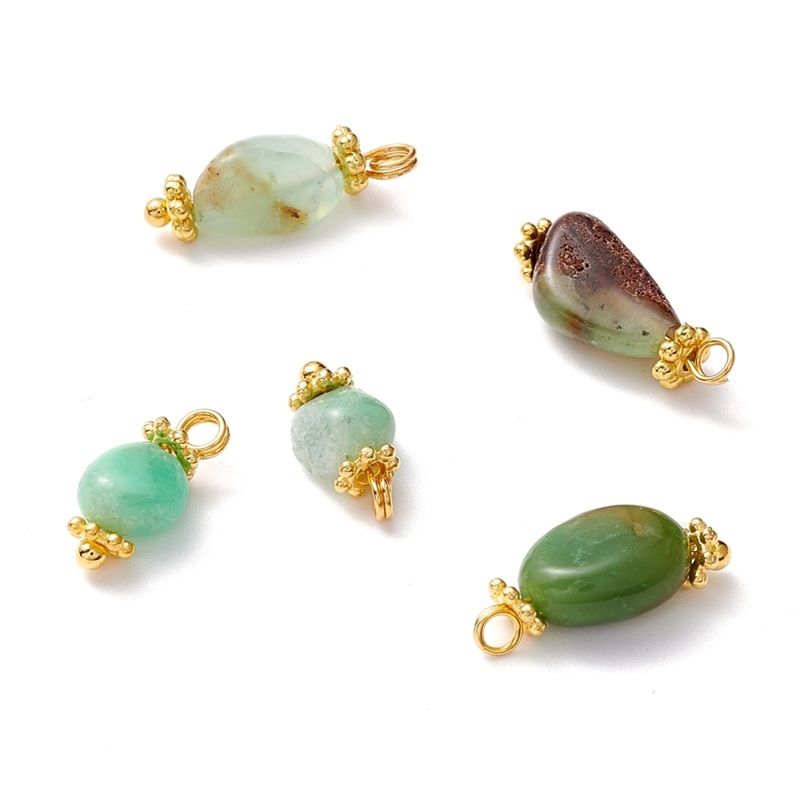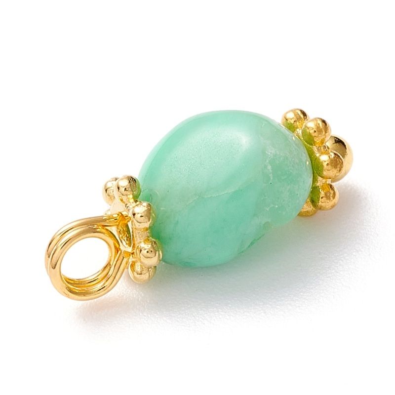 Добавете естествен акцент към вашите бижута с нежна висулка, включваща камък Хризопраз, телче и мъниста от месинг. Всеки камък е уникален, което предава индивидуалност на вашите проекти.