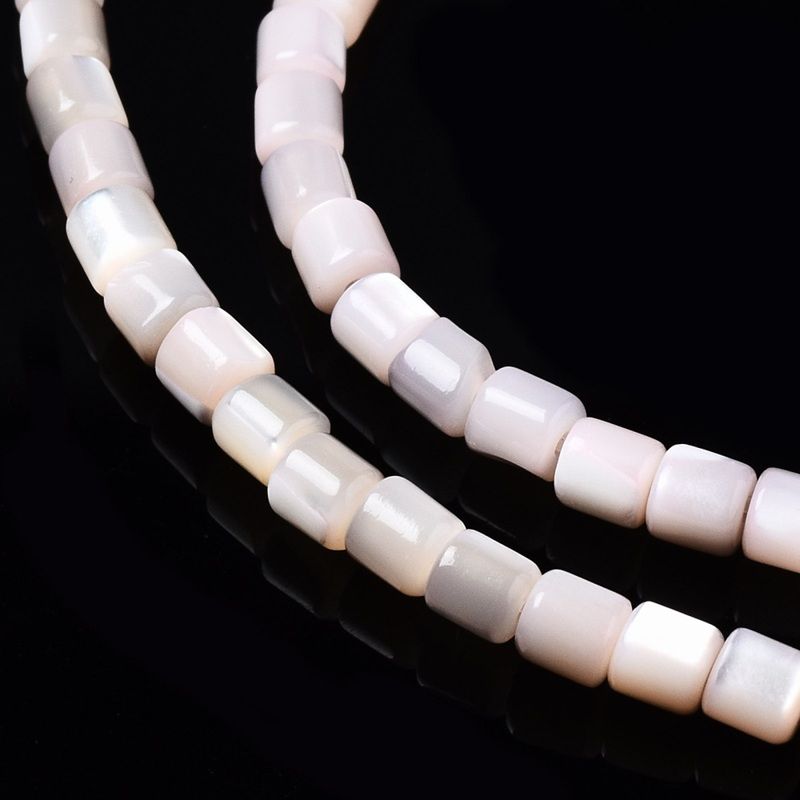 Естествени цилиндрични мъниста, изработени от седеф на морски охлюв Трохус, с добавен, деликатен розов седефен блясък. Подходящи за изработка на гривни, колиета и обеци в бохо или морски стил.