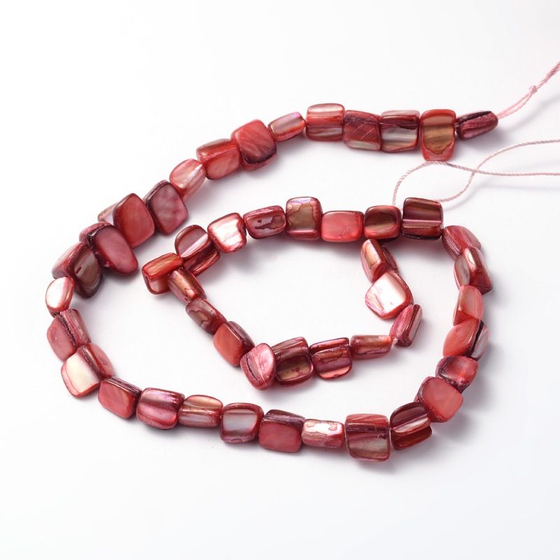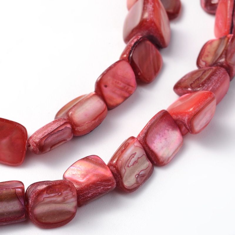 Натурални седефени мъниста от морски черупки с неправилна форма и наситен червен оттенък. Eфектни мъниста идеални за гривни, колиета и обеци с естествен характер.