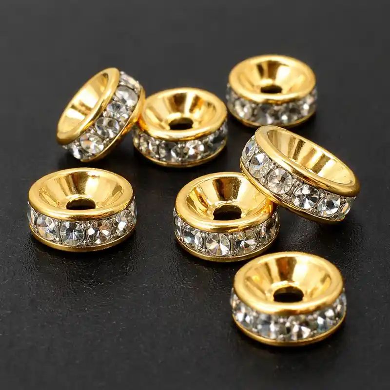 Блестящи метални разделители с вградени прозрачни кристали, идеални за добавяне на светлина и луксозен акцент във вашите проекти. Тези мъниста от Клас В предлагат отличен баланс между цена и качество, правейки ги предпочитан избор за масови дизайнерски бижута.